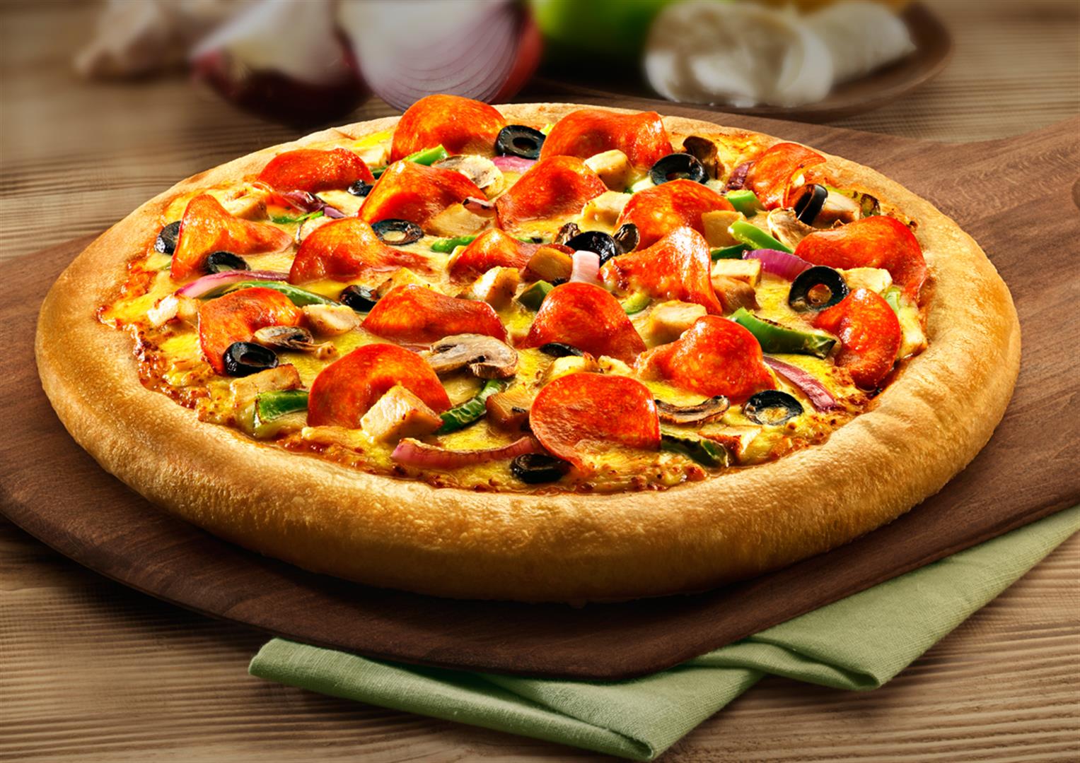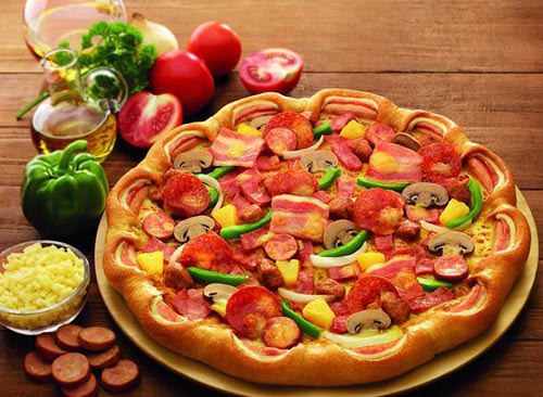 Pepperonis, Cà chua tươi, Hành tây, Oliu, Sốt cà chua, Phomai Mozzarella