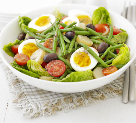 Xà lách, Cà chua, Dưa chuột, Hành tây, Trứng, Sốt dầu dấm
